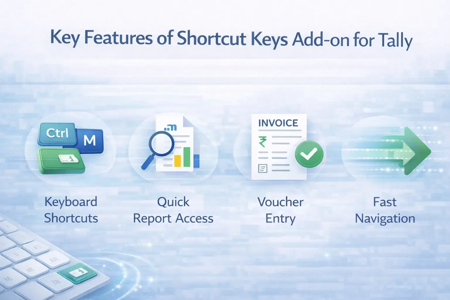 The Quick Access Shortcut Keys Add‑on simplifies this process. Access important Tally functions directly using keyboard shortcuts, eliminating the need to click through deep menus.