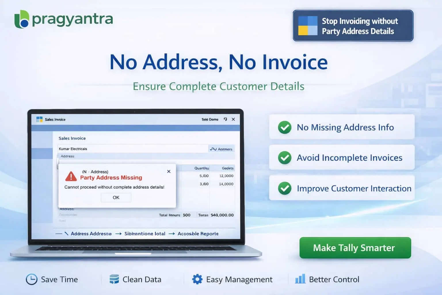 Prevent invoice creation without party address in TallyPrime using Pragyantra’s add‑on. Ensure GST compliance, accurate customer data, and error-free billing.